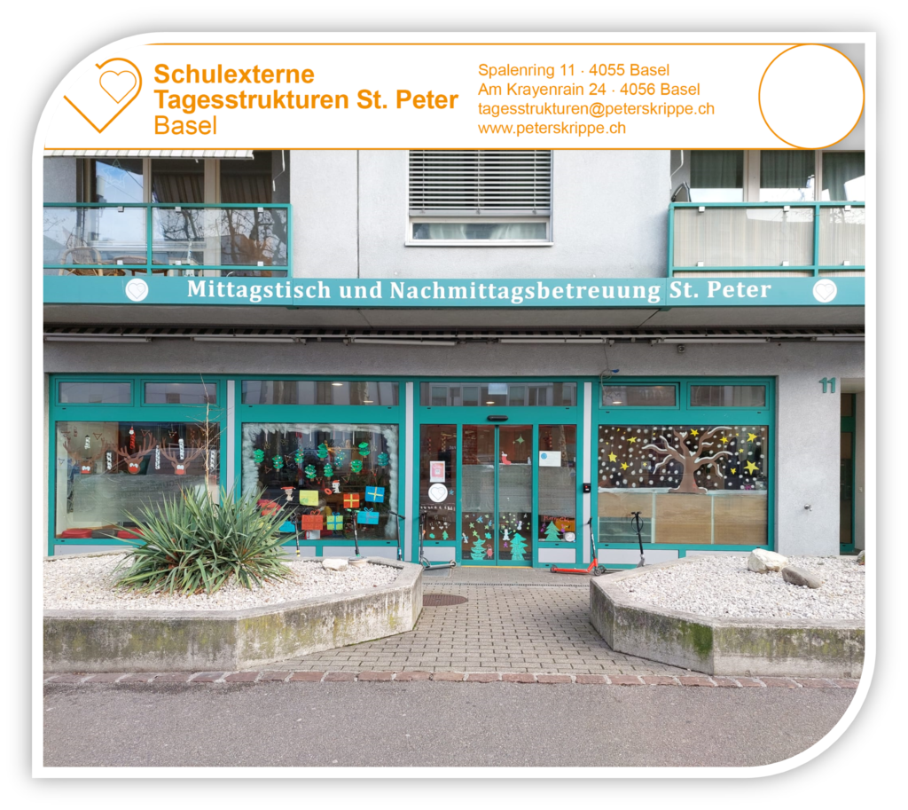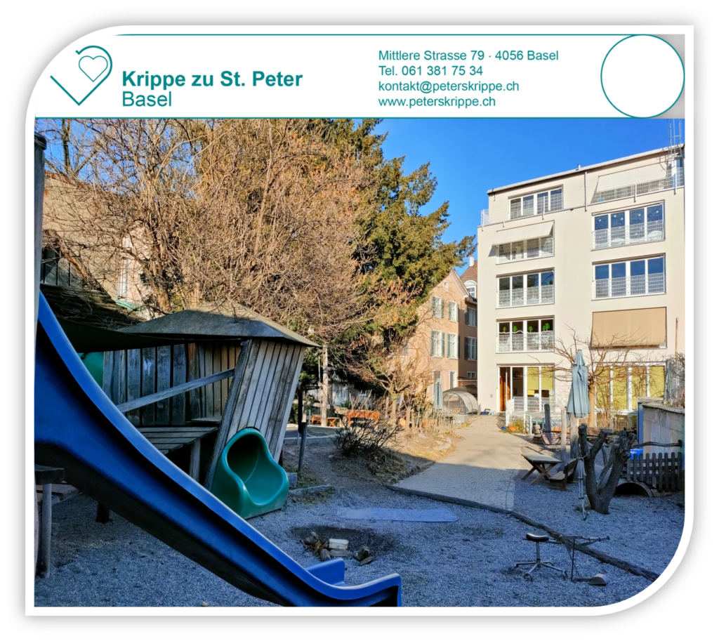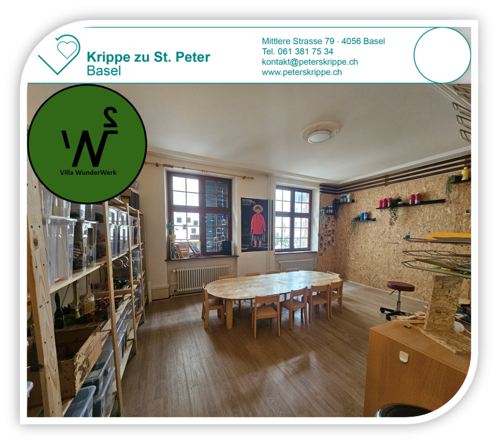 Willkommen beim Verein Krippe zu St. Peter, im Volksmund auch Peterskrippe genannt. Unsere Institution steht seit über 125 Jahren für eine qualitativ hochwertige, professionelle Kinderbetreuung. In unserer Kita an unserem traditionellen Standort an der Mittleren Strasse 79 in Basel bieten wir 54 Betreuungsplätze für Kinder im Alter von 3 Monaten bis zum Kindergarteneintritt an. In unserer Villa Wunderwerk an der Friedensgasse 27 bieten wir weitere 18 Betreuungsplätze für Kinder ab dem Kindergarteneintritt bis zur Vollendung des ersten Schuljahres der Primarstufe an.